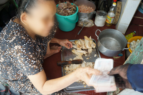 Xương gà, thịt cua làm xong, bà đựng trong những cái khay nồi mà không che đậy mặc ruồi bu bám, đặt ngay cửa nhà vệ sinh và lấn vào toilet. Bà dùng đôi tay trần vừa giã vừa xé thịt. Đang làm, một người bán than mang hàng tới giao, người phụ nữ lấy tiền ra trả và tiếp tục công việc bằng chính đôi tay vừa cầm tiền mà không cần rửa sạch.