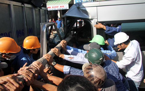 Người dân gần đó dùng xà beng, búa, cây gỗ... phá cửa buồng lái, giải cứu tài xế. 30 phút sau, anh Lành được đưa ra ngoài trong tình trạng xây xát nhẹ. "Chiếc xe tải ở phía trước dừng bất ngờ, khiến tôi không kịp xử lý", tài xế Lành cho hay.