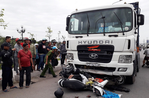 Không dừng lại, chiếc xe container cuốn nhiều xe máy cùng các nạn nhân vào gầm kéo lê một đoạn dài trên đường. Ảnh: Zing.