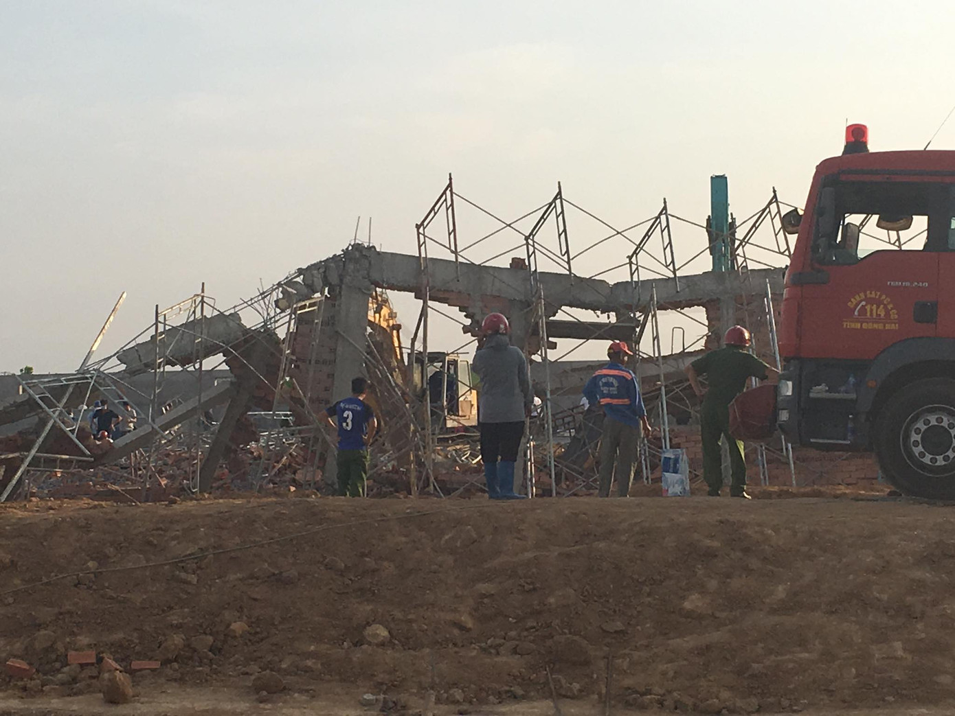 Tại hiện trường, gạch đá, nhiều giàn giáo, bêtông, sắt thép nằm ngổn ngang.