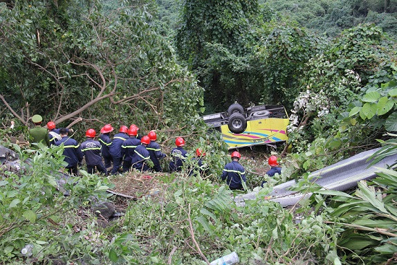 Ngay sau khi nhận được thông tin về vụ tai nạn, Công an tỉnh đã chỉ đạo Cơ quan Cảnh sát điều tra Công an tỉnh, Công an huyện Phú Lộc, các phòng CSGT, Cảnh sát PCCC phối hợp với Bộ đội biên phòng Lăng Cô, Công an Quận Liên Chiểu, Cảnh sát PCCC Công an TP Đà Nẵng huy động phương tiện và lực lượng để cứu hộ cứu nạn, đưa người từ vực lên cấp cứu Lực lượng PCCC xử lý tại hiện trường để không xảy ra cháy nổ. Ảnh: Giang Thanh
