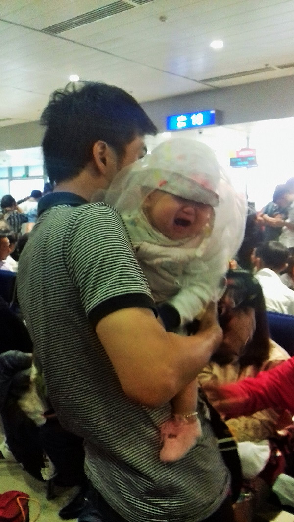 Dù chưa đủ một tuổi nhưng bé cũng phải chờ máy bay đến trễ