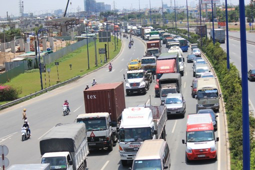 Đến 13h chiều 9/5, các tuyến đường xa lộ Hà Nội – Mai Chí Thọ - Đồng Văn Cống– Nguyễn Thị Định dẫn vào cảng Cát Lái (Q. 2, TP.HCM) vẫn xảy ra tình trạng kẹtxe nghiêm trọng.