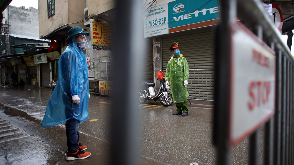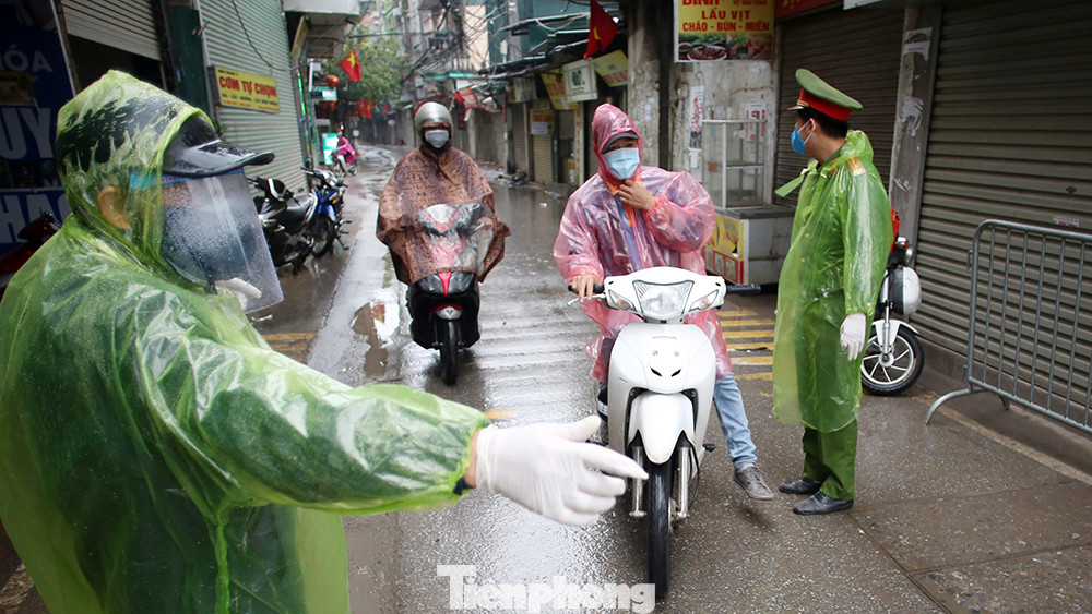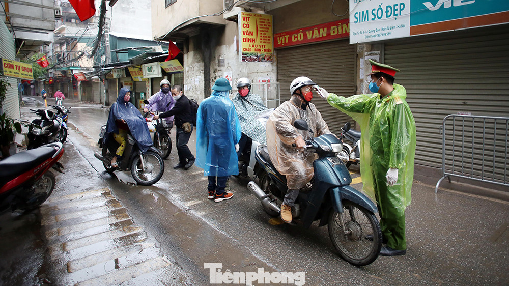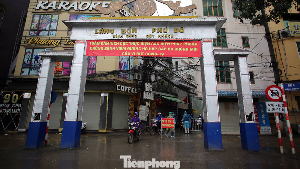 Tại cổng làng bún Phú Đô thuộc địa bàn phường Phú Đô (quận Nam Từ Liêm, Hà Nội) sáng 4/4, trong cái lạnh của cơn mưa phùn ngày cuối tuần, lực lượng chức năng vẫn tiếp tục duy trì chốt kiểm tra y tế chống dịch Covid-19.
