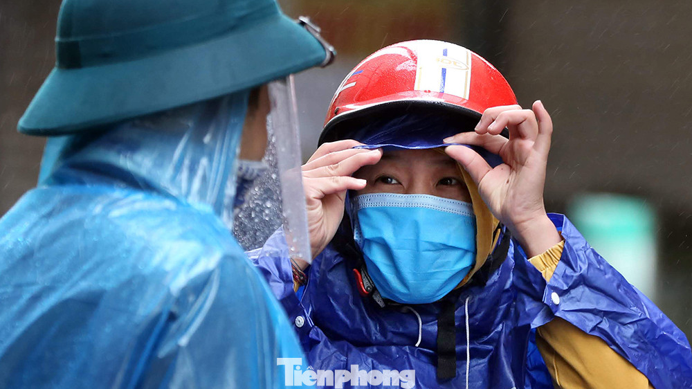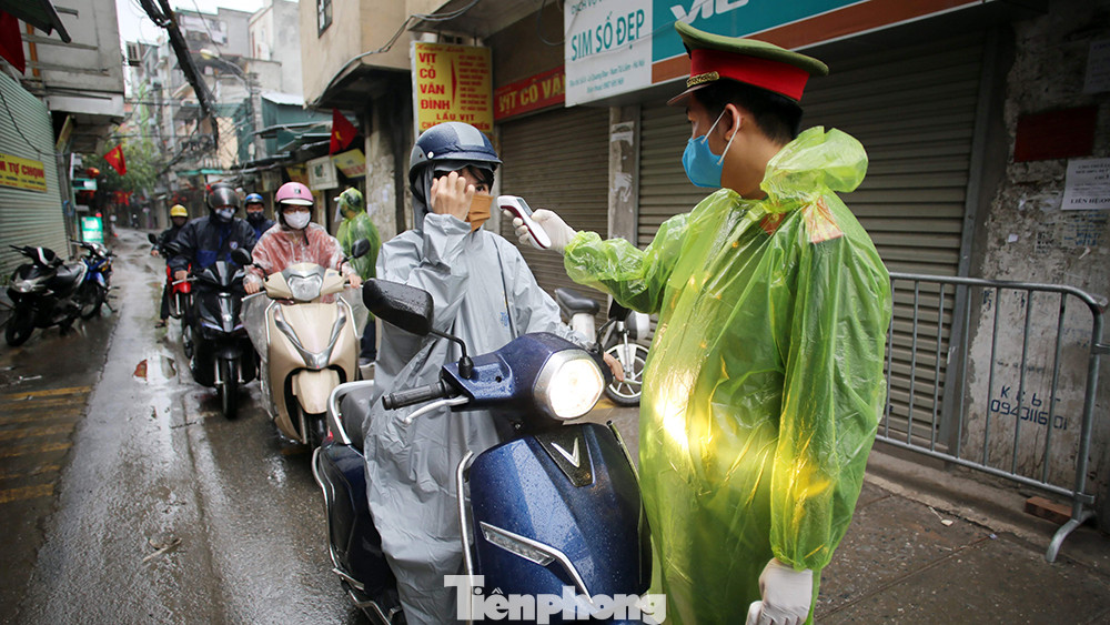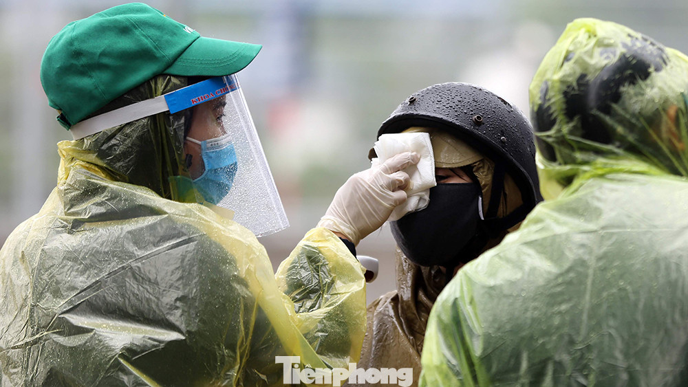 Sáng nay trời có mưa nặng hạt khiến công tác kiểm soát và kiểm tra thân nhiệt người dân trở nên vất vả đối với lực lượng chức năng.