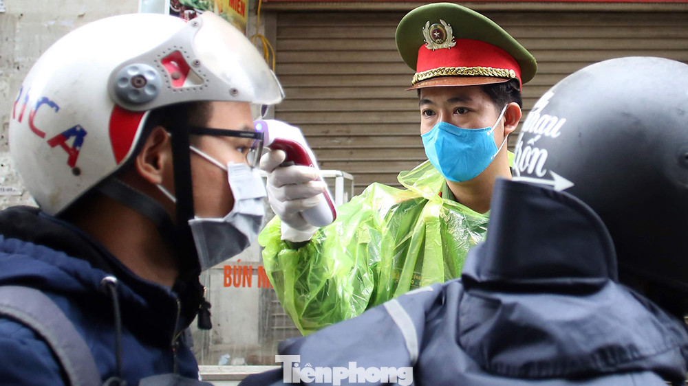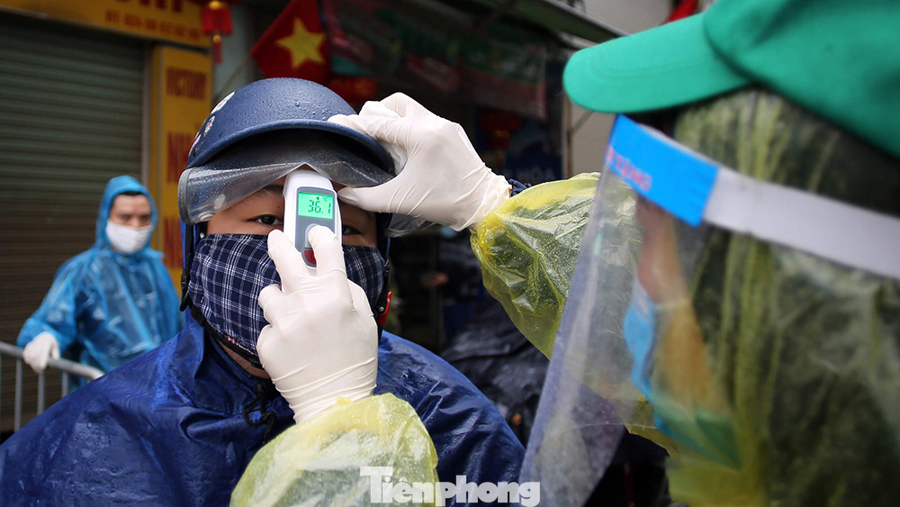 Toàn bộ người dân đi qua trạm kiểm soát đều được kiểm tra thân nhiệt cẩn thận trước khi di chuyển.