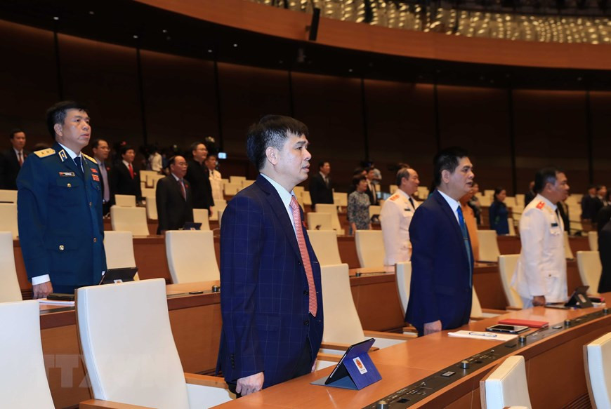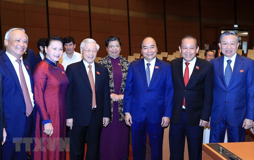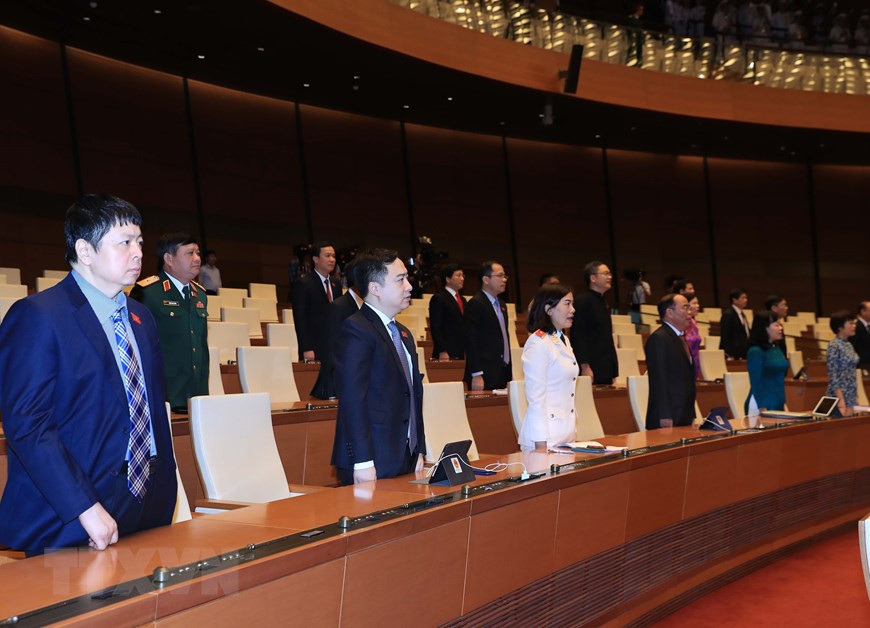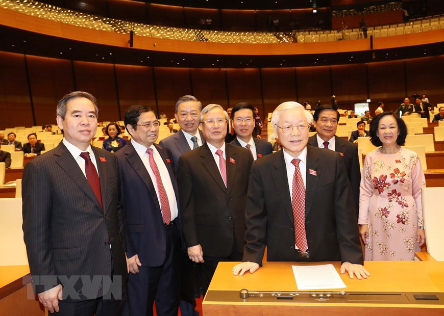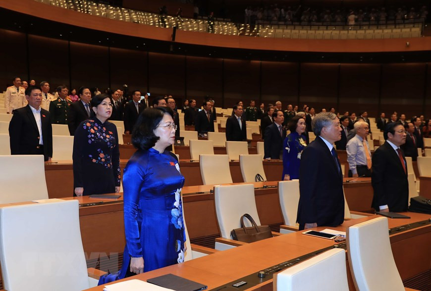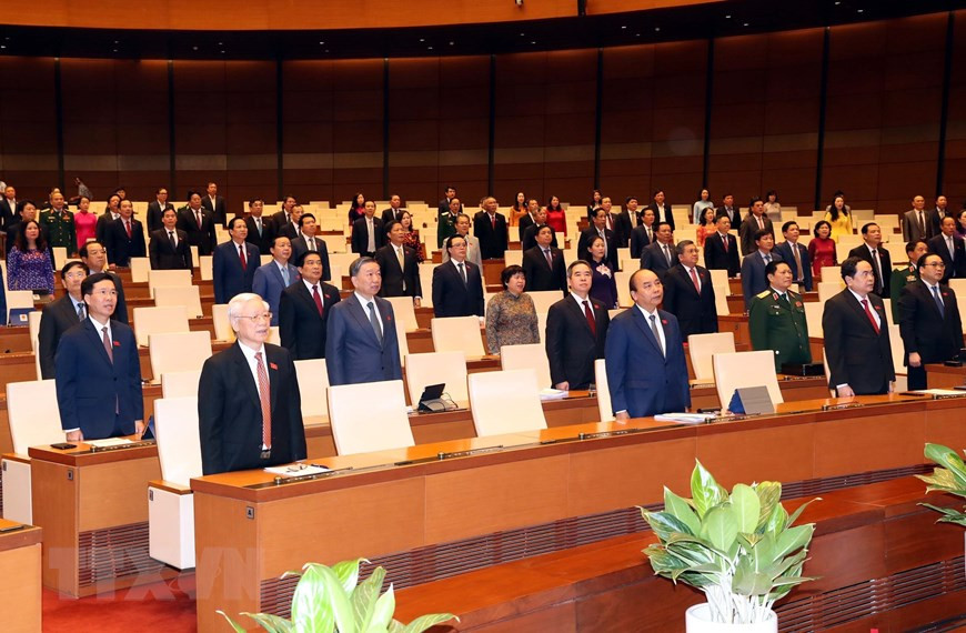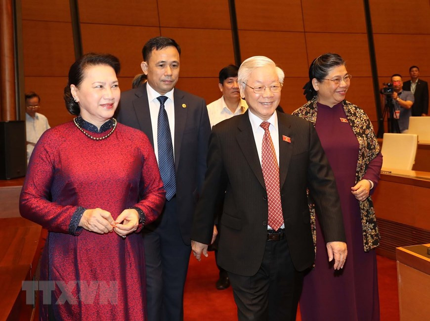Tổng Bí thư, Chủ tịch nước Nguyễn Phú Trọng, Chủ tịch Quốc hội Nguyễn Thị Kim Ngân dự phiên khai mạc. (Ảnh: TTXVN)