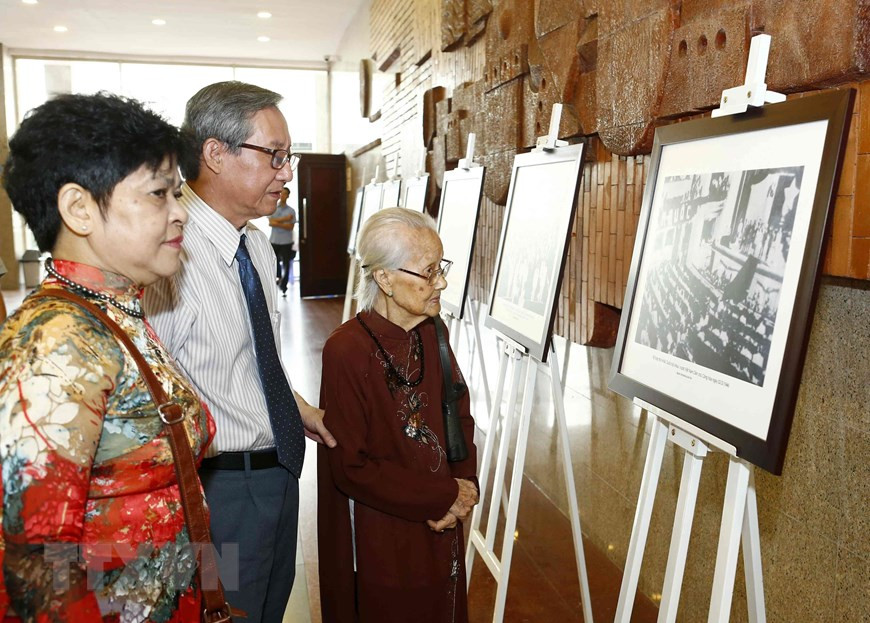 Con gái của nguyên Trưởng ban Thường trực Quốc hội Bùi Bằng Đoàn (người đứng hàng đầu bên phải) tham quan trưng bày ảnh tại lễ kỷ niệm. (Ảnh: TTXVN)