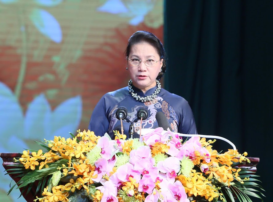 Chủ tịch Quốc hội Nguyễn Thị Kim Ngân phát biểu tại lễ kỷ niệm. (Ảnh: TTXVN)
