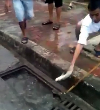 Cá nhảy lên bờ sau khi có người khoắng gậy xuống hố ga (Ảnh cắt từ clip).