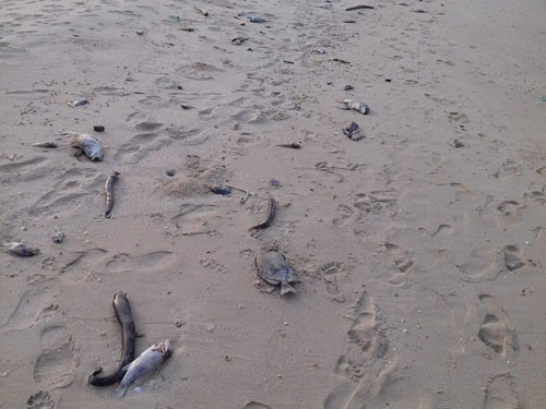 Cá chết nằm la liệt kéo dài hàng trăm mét trên bờ và đã bắt đầu phân hủy bốc mùi nồng nặc. Ngoài ra, cũng có rất nhiều con cá, mực mới chết trôi nổi vào bờ.