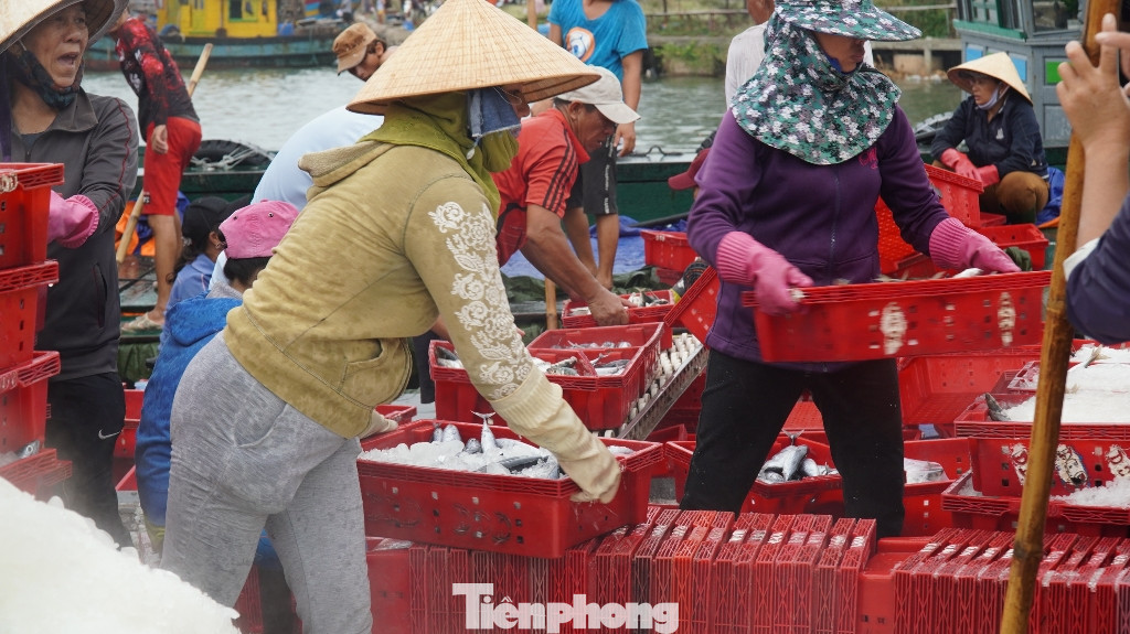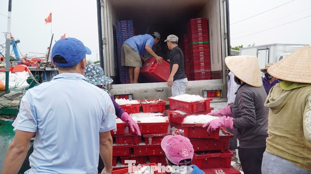 Tại cảng cá Thuận An trưa 17/9, nhiều phương tiện vận tải gắn thùng đông lạnh đã chờ sẵn để chở những mẻ tôm, cá tươi đi tiêu thụ hoặc tập kết vào kho bãi trước khi bão số 5 di chuyển vào đất liền.