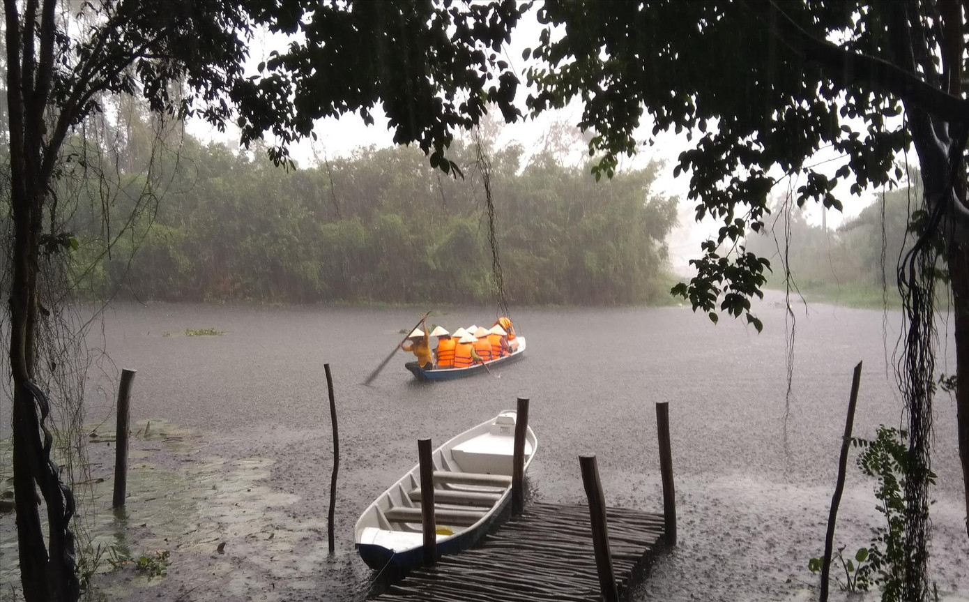 Những trận mưa đồng bằng xối xả, gió rung chuyển cả rừng tràm mà đoàn thuyền đưa khách vẫn cứ lội mưa mà đi. “Mùa mưa ở đây kéo dài mấy tháng, du khách nhiều người lại muốn trải nghiệm cảm giác đi thuyền trong mưa”. Chị Thặng là đội trưởng đội chèo thuyền. Chị đã quá quen cảnh đội nón, chèo thuyền chở khách trong những cơn mưa trắng trời. Thuyền đang trong rừng tràm, trời bỗng đổ mưa to, khách lẫn chủ đều ướt rượt. Khách mặc áo phao che thân, còn chị Thặng và các bạn hứng trọn những cơn mưa lớn.