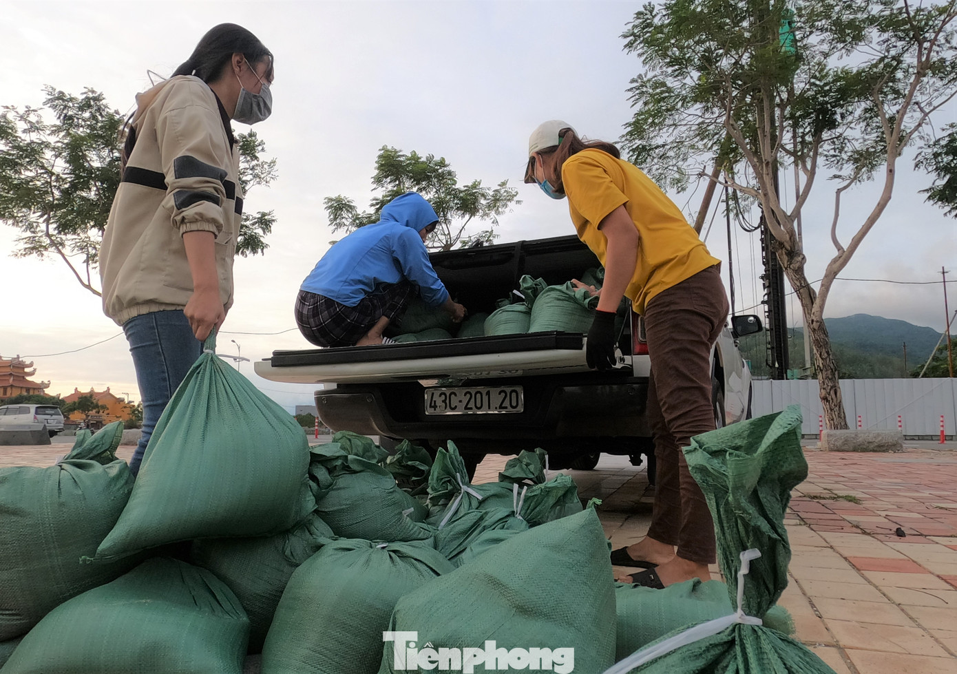 Tại bờ biển dọc đường Nguyễn Tất Thành (Liên Chiểu), Mân Thái, Hoàng Sa (Sơn Trà).., người dân cũng hối hả xúc cát để vào bao tải lớn để chèn mái nhà.