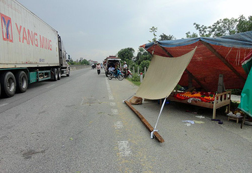 Người nhà dựng lán bên đường mai táng cho nạn nhân. Ảnh: Trần Hưng