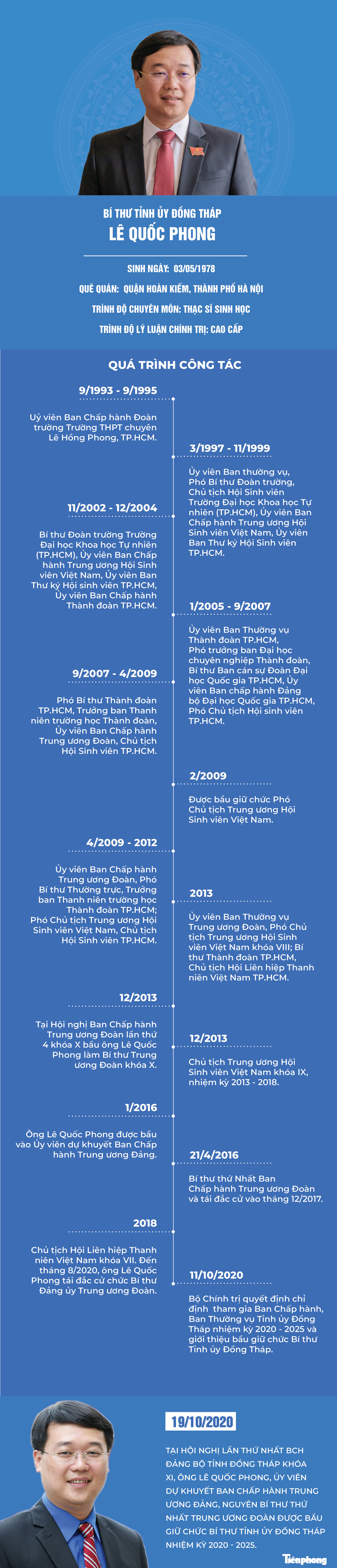 TPO - Ngày 19/10, tại Hội nghị thứ nhất, Ban Chấp hành Đảng bộ tỉnh Đồng Tháp khóa XI, ông Lê Quốc Phong, Ủy viên dự khuyết Ban chấp hành Trung ương Đảng, nguyên Bí thư thứ nhất Trung ương Đoàn, được bầu giữ chức Bí thư Tỉnh ủy Đồng Tháp nhiệm kỳ 2020 - 2025.