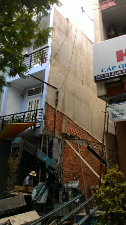 Căn nhà 3 tầng bị nghiêng, có khả năng bị sập khi nhà bên cạnh thi công xây mới.