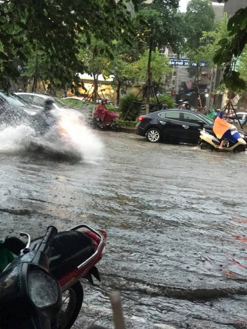 Tại ngã tư Văn Cao - Đội Cấn, nước mưa dâng cao ngập quá nửa bánh xe máy khiến nhiều phương tiện di chuyển khó khăn. Ảnh: Saostar
