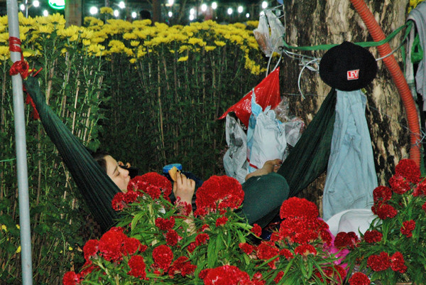 Bữa ăn đêm trên cánh võng của cô gái bán hoa miền Tây. Mỗi gian hàng giá thuê trung bình 5 triệu đồng, nhiều chủ vườn thuê 3,4 gian, có người thuê cả chục gian để bán hoa Tết. Năm nay hoa nở sớm, nhiều người lo bị lỗ nên ăn ngủ không yên.