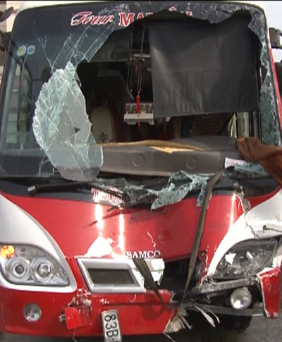 Cú tông mạnh khiến xe khách do ông Hiền lái vỡ nát phần đầu.