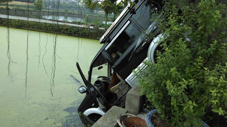Sáng nay, ông B. nổ máy chiếc xe Jolie Mitsubishi đang để trong sân nhà để chuẩn bị đi làm. Khi xe vừa nổ máy thì bất ngờ lao thẳng ra đường rồi phi luôn xuống chiếc ao phía đối diện nhà ông B. Rất may gờ ao có dải bê tông nên sau khi húc bay dải bê tông, chiếc xe giảm tốc độ, chúc đâu xuống ao và mắc lại. Ông B. may mắn chỉ bị thương nhẹ ở chân và thoát ra ngoài an toàn.