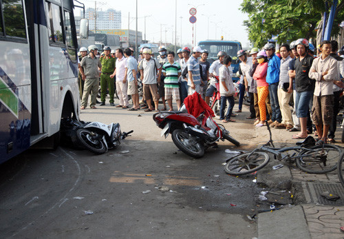 Sáng 9/3, 4 xe máy và một xe đạp ở giao lộ Tây Lân - Quốc lộ 1A, quận Bình Tân, TP HCM đã bị ôtô chở gần 30 người đi ăn cưới tông từ phía sau, cuốn vào gầm và làm 3 người bị thương.