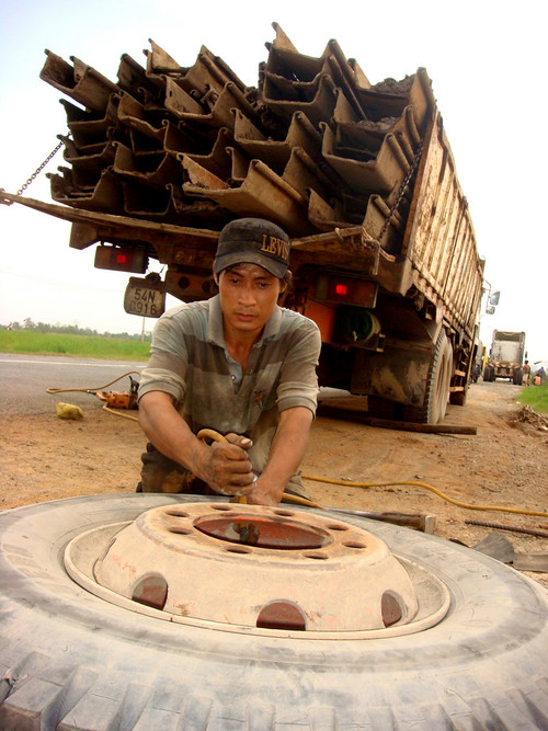 Tài xế Đàm Chiến và hai phụ xe trẻ tuổi nhảy xuống kiểm tra, phát hiện một bánh xe sau đã “hở hàm ếch”, không còn tí hơi. Anh Chiến móc điện thoại gọi dịch vụ vá vỏ lưu động. Sau một hồi trao đổi, đầu bên kia hỏi địa điểm nơi chiếc xe “nằm” rồi hẹn: Khoảng nửa tiếng sau có mặt. Trong lúc chờ, anh Chiến kể mấy năm nay ngày nào anh cũng chạy xe từ Nhà Bè đến huyện Trảng Bom (Đồng Nai) chở củi. Từ khi cầu Phú Mỹ nối quận 7 và quận 2 thông xe, anh chọn đi đường này vì gần hơn đáng kể so với đi đường cũ. Tuy nhiên, vì đường chưa hoàn thiện, mặt đường khá xấu và nhiều “ổ voi” nên nguy cơ xe bị bể bánh rất cao.