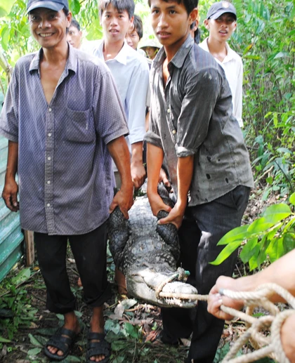 Trong khi công nhân trang trại nuôi cá sấu của Cty Quốc Việt mải mê ở ao vườn, bụi rậm thì một con cá sấu gần 70 kg được người dân bắt giữ ngoài khu vực nghi vấn, đã được rào chặn trước đó.