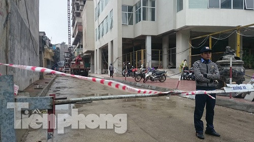 Vụ tai nạn xảy ra tại tòa nhà cao tầng đang xây dựng tại số 52 Lĩnh Nam. Trong ảnh: Lối vào hiện trường bị phong tỏa sau khi tai nạn xảy ra.