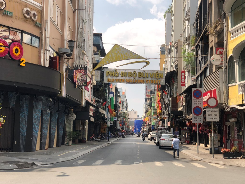 Phố đi bộ Bùi Viện (Q.1) vắng vẻ khi có lệnh tạm đóng cửa nhà hàng, quán bar, vũ trường để phòng dịch COVID-19.