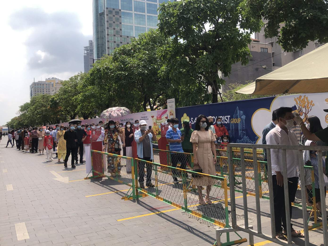 Người dân xếp hàng, đo nhiệt độ trước khi vào tham quan đường hoa Nguyễn Huệ.