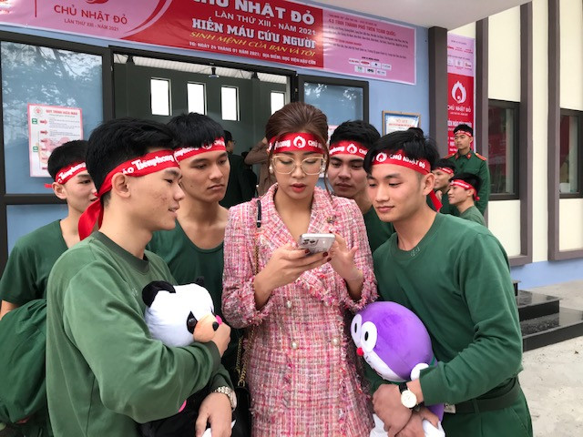 Người đẹp Trần Ngọc Bích và Đặng Vân Ly (tham gia Cuộc thi Hoa hậu Việt Nam) động viên các bạn trẻ hiến máu