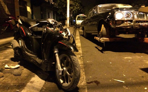 Chiếc SH bị cuốn vào gầm, đập vào cột điện hư hỏng nặng. Hai người ngồi trên xe SH bị bắn ra ngoài nên chỉ bị thương nhẹ.