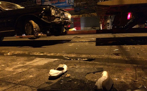 Tại hiện trường, xe máy SH và ôtô bị hư hỏng nặng. Bên trong cabin ôtô biển xanh còn rất nhiều mảnh ghế vỡ, bếp than tổ ong, gạch đá do người dân ném vào. Đôi giày của một bé gái vương vãi trên nền đường.