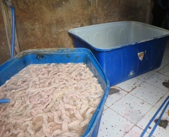 Tại cơ sở sơ chế, chế biến sản phẩm động vật của ông Nguyễn Văn Quảng (4B đường Trung Mỹ Tây 13, P.Trung Mỹ Tây, Q.12), đoàn kiểm tra phát hiện gần 2,3 tấn lòng heo không rõ nguồn gốc. Đáng chú ý, khu vực sơ chế có 4 bình nhựa nhãn hiệu INTEROX ST 50 có thành phần là H2O2 (oxy già) đã qua sử dụng. Ông Quảng khai đã dùng oxy già để tẩy rửa lòng dơ và bị đen để làm trắng lòng, sau đó bán làm thực phẩm.