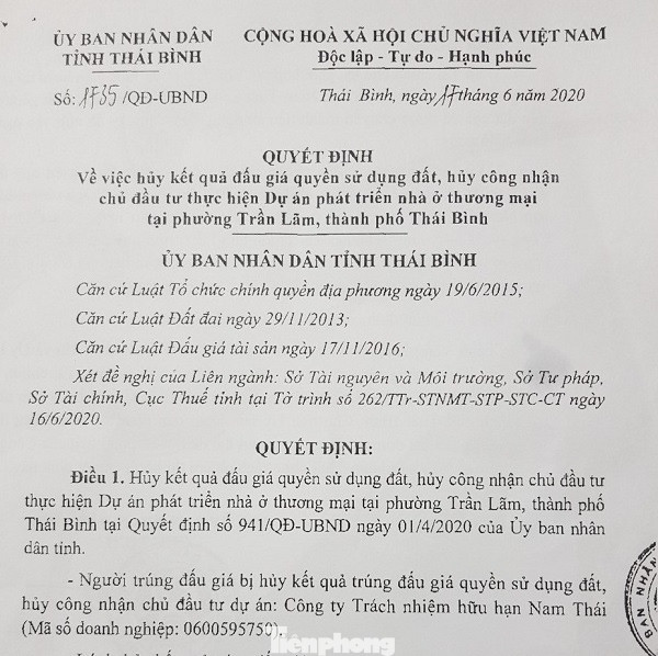 Theo quyết định số 1735 do Chủ tịch UBND tỉnh Thái Bình vừa ký, cùng với quyết định huỷ kết quả đấu giá và thu hồi 128 lô đất, UBND tỉnh Thái Bình này giao cho Sở Tài chính phối hợp Cục Thuế tỉnh thực hiện hoàn trả tiền cho Công ty Nam Thái là đơn vị đã trúng thầu đấu giá 128 lô đất này, giao Sở Tài nguyên - môi trường chỉ đạo Trung tâm Phát triển quỹ đất và kỹ thuật tài nguyên hoàn trả lại số tiền mà Công ty Nam Thái đã nộp vào trung tâm và tiếp tục quản lý chặt chẽ khu đất, đưa ra đấu giá công khai để lựa chọn chủ đầu tư thực hiện dự án.