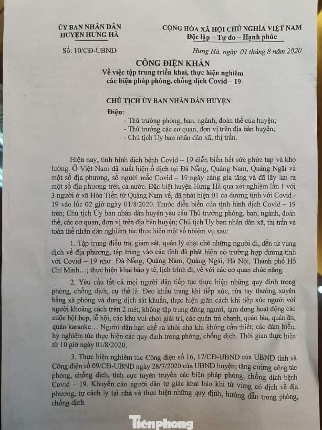 UBND huyện Hưng Hà cũng ra văn bản nâng mức cảnh báo dịch lên mức tối đa, yêu cầu tất cả người dân toàn huyện thực hiện giãn cách 2 m với người khác, đeo khẩu trang khi ra ngoài, không tập trung chỗ đông người, tạm dừng các lễ hội; đồng thời đóng cửa khu vui chơi giải trí, quán karaoke, quán trà chanh, quán bia, quán ăn. Người dân trở về từ vùng dịch chủ động khai báo y tế, tự cách ly tại nhà.