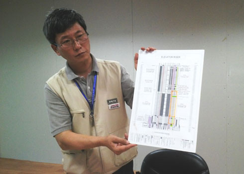 Trao đổi với báo chí chiều 26/9, ông Lee Chong Hee, phụ trách kỹ thuật thang máy tại tòa nhà Lotte cho biết, lúc 21h ngày 25/9, 7 vị khách sử dụng thang máy H4 tại khu vực khách sạn đi từ tầng 63 xuống. Khi thang máy đang di chuyển với tốc độ thông thường, thiết bị cảm biến nhận thấy thang rung lắc hơn bình thường. Do đó thiết bị cảm biến an toàn MOSIS được bật và điều khiển buồng thang tự động trôi xuống tầng 29.