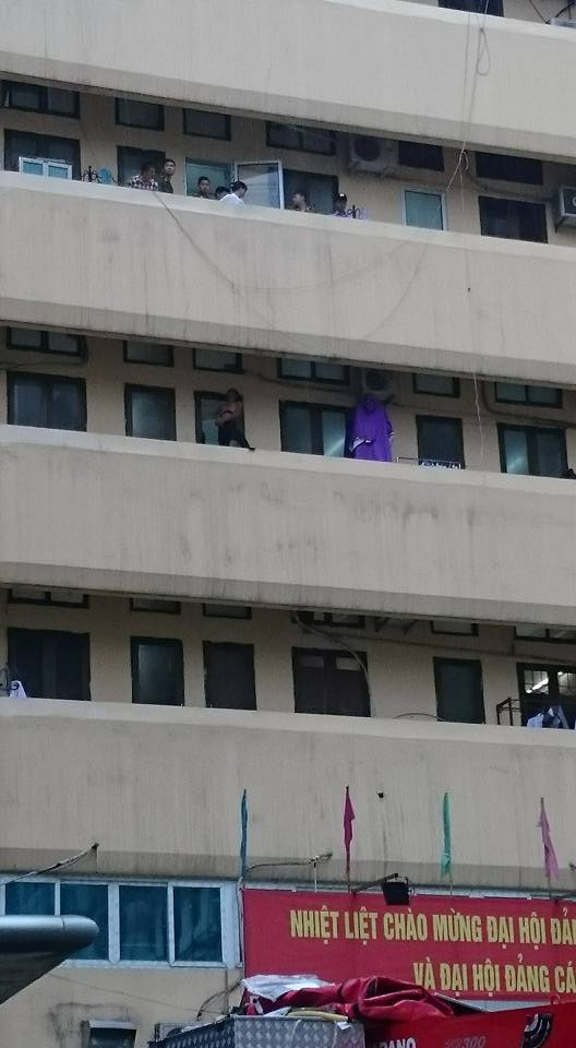Thanh niên trên cởi trần, mặc mỗi quần dài màu đen, đứng trên lan can khua tay múa chân, la hét inh ỏi.