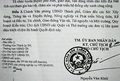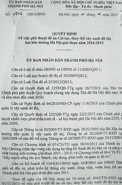 Theo thông tin chúng tôi có được, đề án cải tạo, thay thế cây xanh đô thị hai bên đường Hà Nội giai đoạn 2014-2015 do Phó Chủ tịch UBND TP Hà Nội Nguyễn Văn Khôi ký quyết định phê duyệt ngày 11-11-2013.