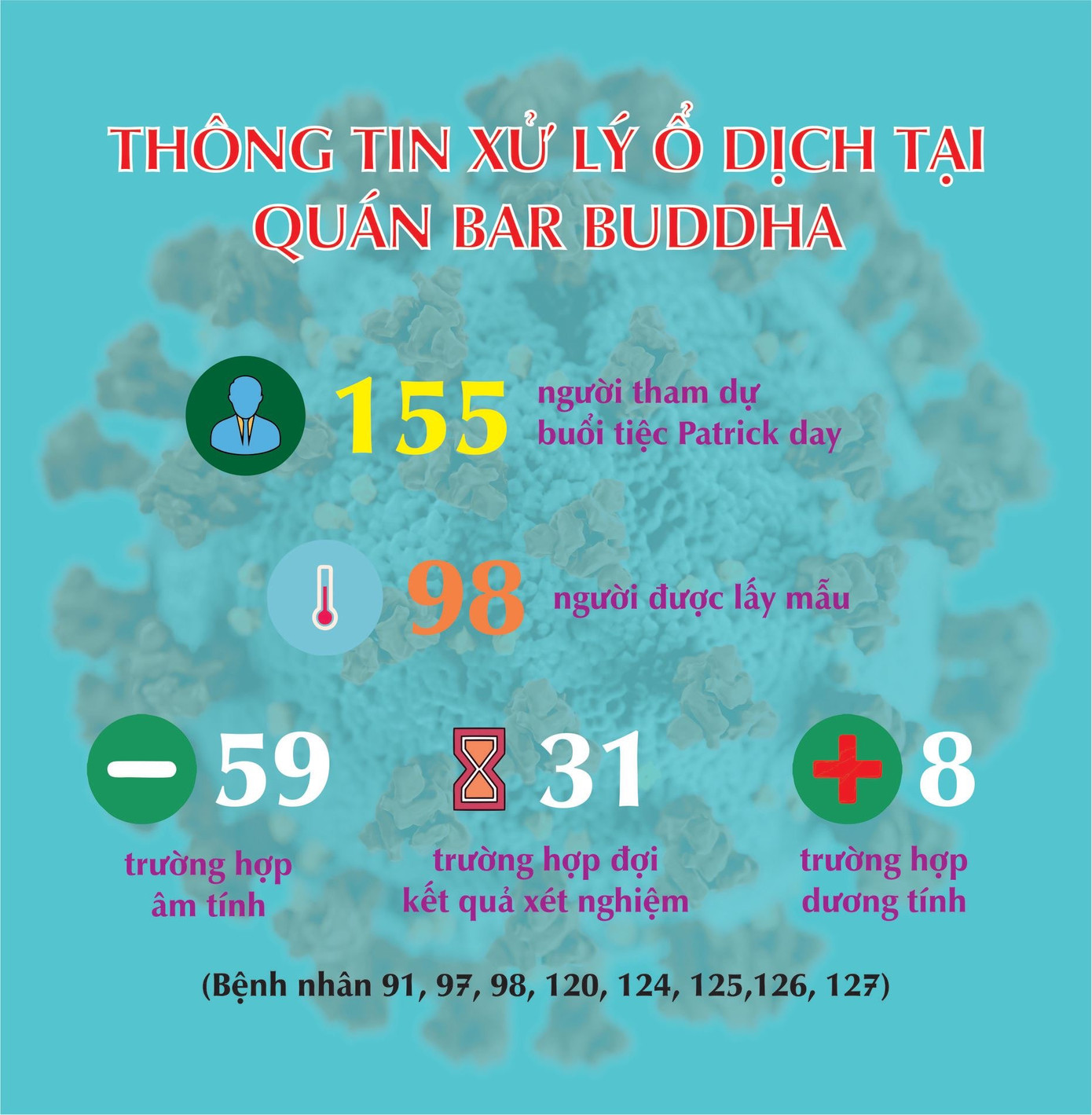 Đã có ít nhất 8 trường hợp nhiễm COVID-19 liên quan đến quán Bar Buddha này gồm các bệnh nhân 91, 97, 98, 120, 124, 125, 126, 127. Do đó, Trung tâm Kiểm soát bệnh tật TPHCM cho biết cần đặc biệt chú trọng, thực hiện các biện pháp phòng dịch bệnh liên quan đến ổ dịch tại quán Bar Buddha.