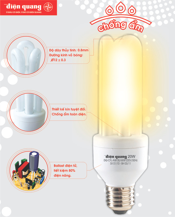 Bước tiến mới trong công nghệ sản xuất, bóng đèn compact chông ẩm của Điện Quang là giải pháp tối ưu cho việc thắp sáng ngoài trời, khắc phục triệt để hiện tượng bóng đèn bị hỏng do sốc nhiệt và côn trùng chui vào bóng.