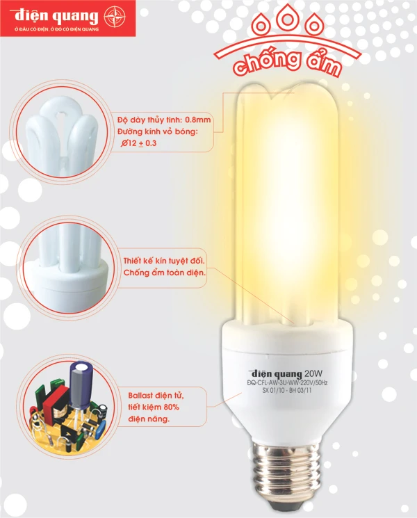 Bóng đèn Compact chống ẩm của Điện Quang được thiết kế kín tuyệt đối theo tiêu chuẩn IP 65 với vỏ bóng thủy tinh được tăng cường độ dày gấp đôi bóng thường giúp tăng độ bền cơ học.