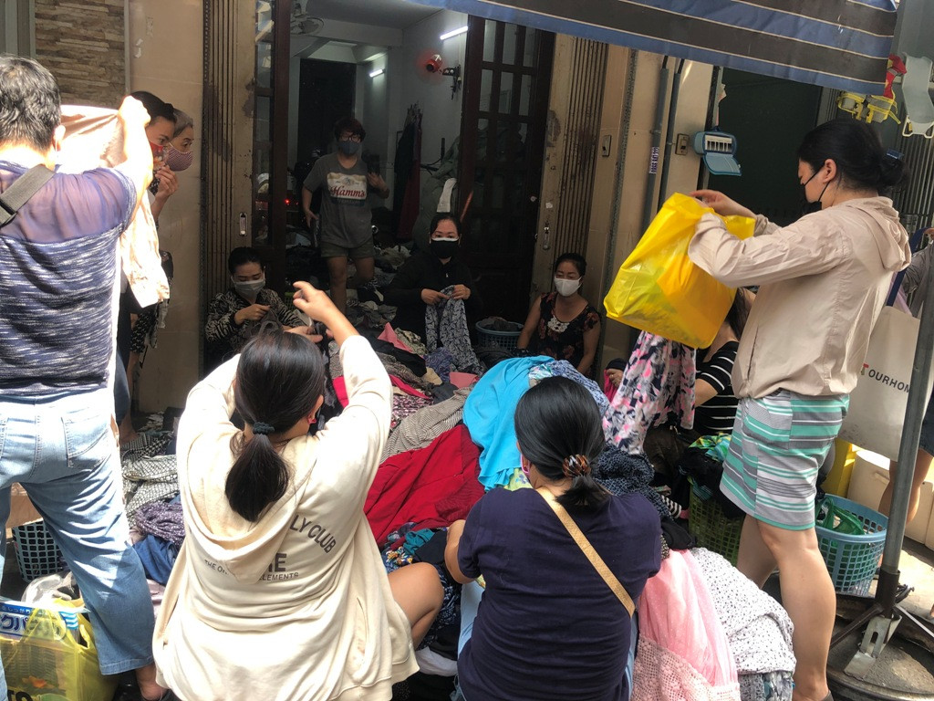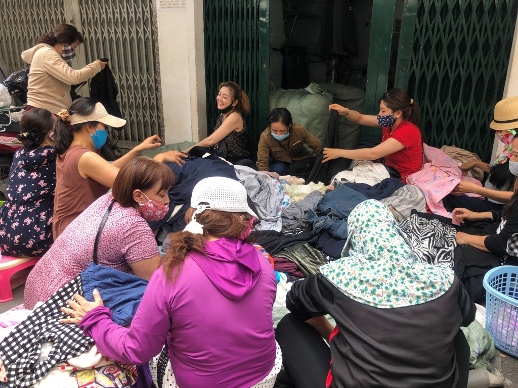 Một tiệm kinh doanh quần áo si-da (đồ cũ) tấp nập khách nữ chọn hàng. Ai cũng mong lựa được những bộ đồ vừa ý nên không chú ý giữ khoảng cách 2 mét với người kế bên.