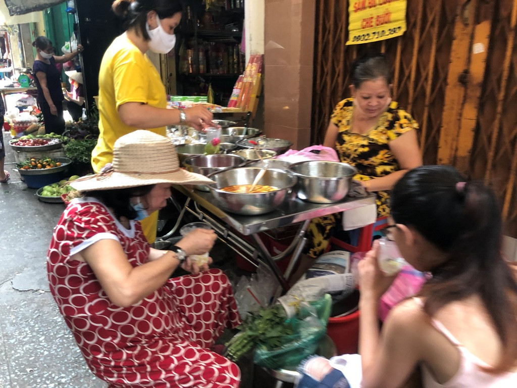 Hàng quán nhỏ trong chợ cũng kê bàn ghế cho khách ngồi, không còn treo biển "bán mang về" như trước nữa.