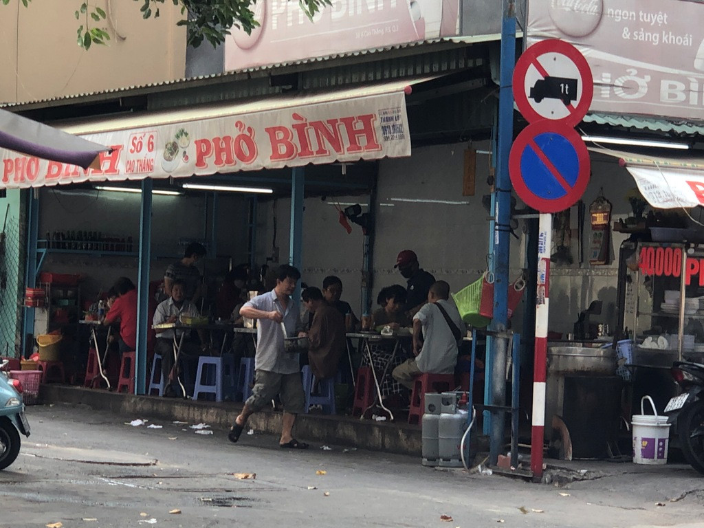 Quán phở tấp nập khách. Do tiệm nhỏ, nhiều bàn ghế lại đông khách nên các biện pháp phòng dịch COVID-19 khiến nhiều người lo lắng, nhất là người bán, phục vụ lại "quên" khẩu trang khi phục vụ khách.