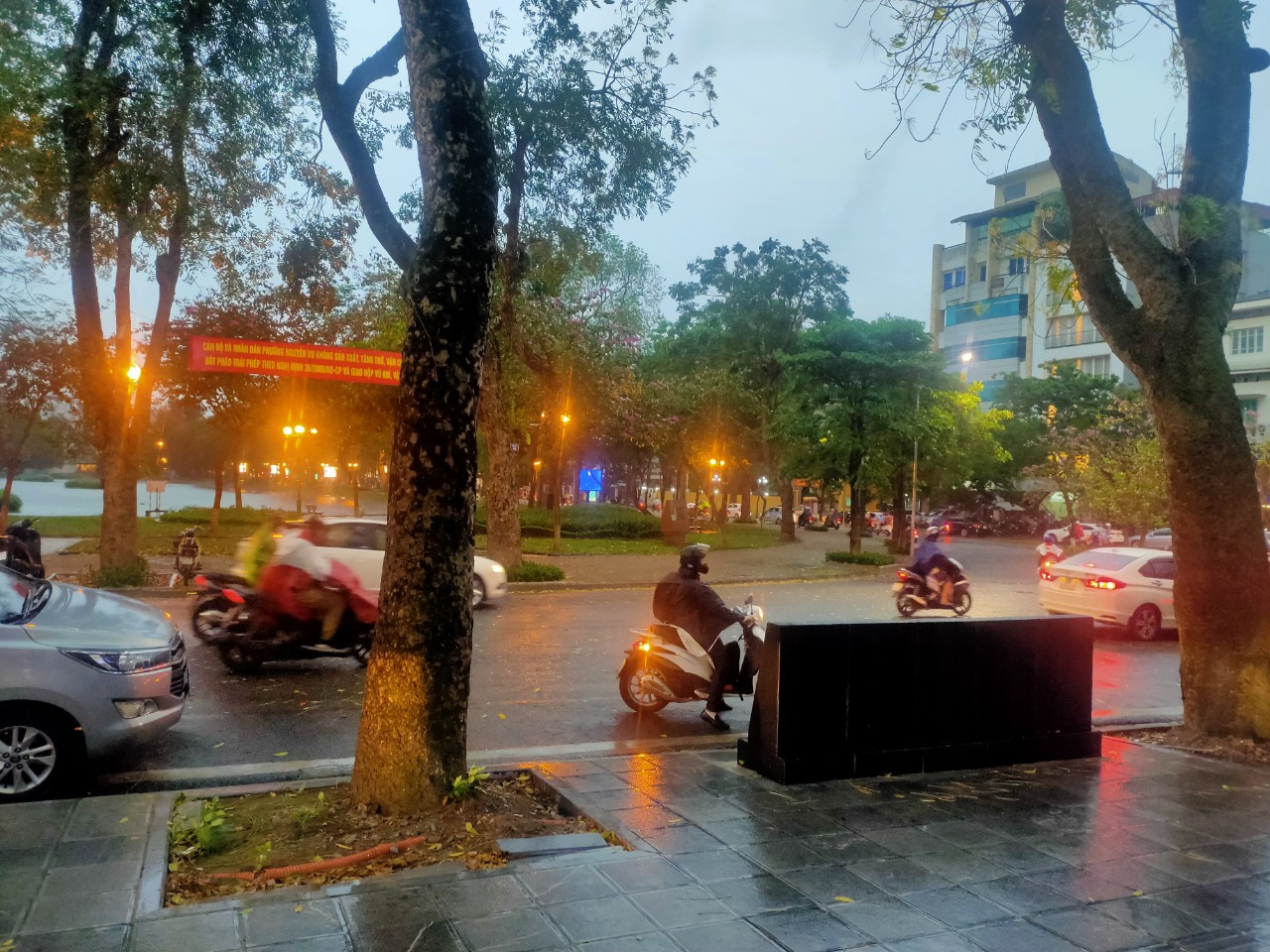 Ảnh chụp lúc 17g20 trên phố Khâm Thiên, Hà Nội. Ảnh Châu Anh Theo Trung tâm dự báo thời tiết: Thời tiết Hà Nội nhiệt độ ban ngày dao động 29-32 độ; chiều tối có mưa rào và giông rải rác. Trong cơn giông có khả năng xảy ra lốc, sét, mưa đá và gió giật mạnh. Nhiệt độ thấp nhất ở mức 22-25 độ.