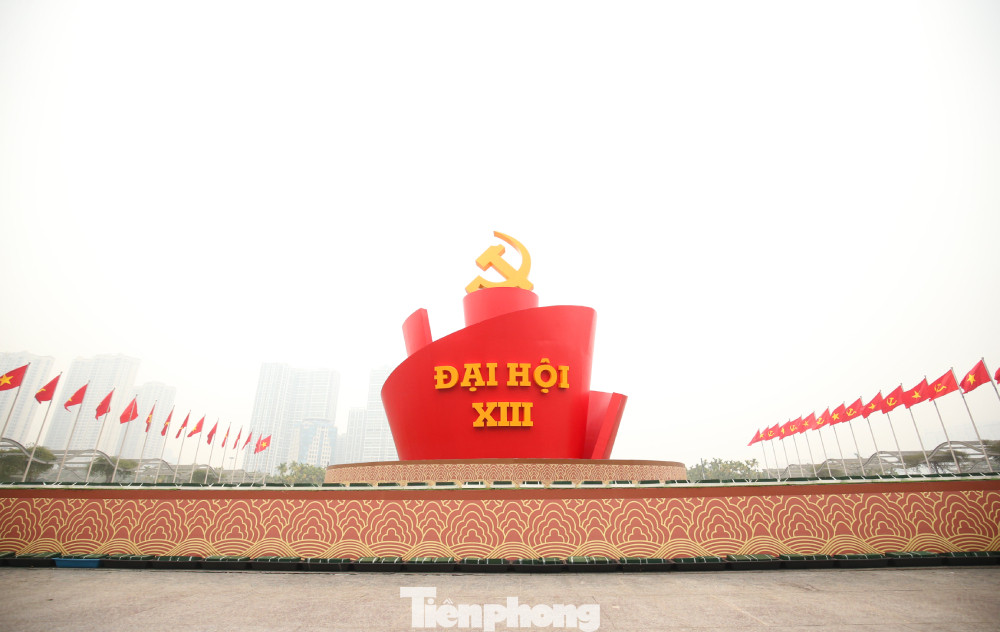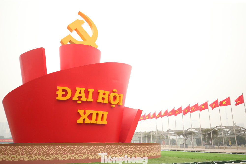 Trung tâm Hội nghị Quốc gia được trang hoàng rực rỡ để chuẩn bị cho Đại hội đại biểu toàn quốc lần thứ XIII của Đảng.