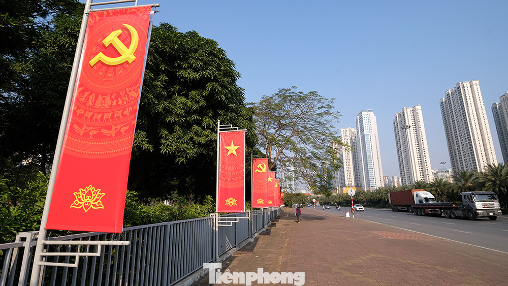 Đường Phạm Hùng được trang trí hoa và băng-rôn, tạo không khí hân hoan và niềm tin cả nước hướng về sự kiện trọng đại của Đảng và đất nước