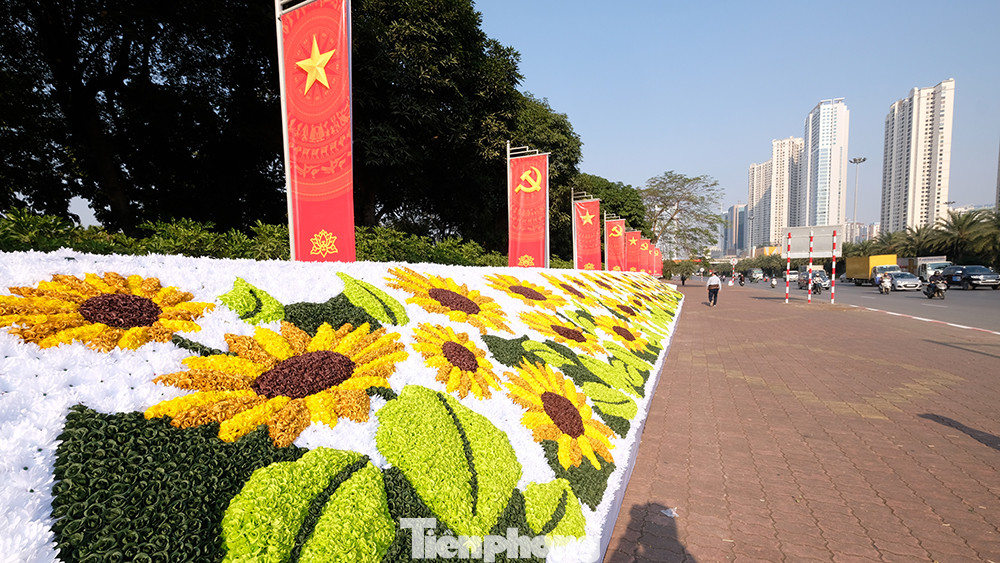 Một thảm dài hoa lụa được lắp đặt học đường phía ngoài đại lộ Thăng Long.